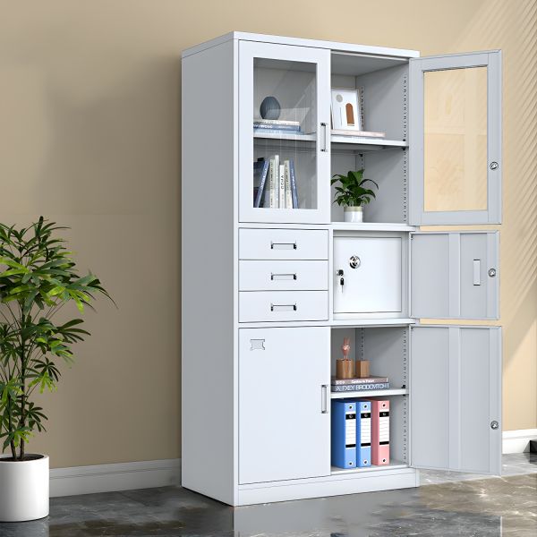 Maximize your office storage efficiency with the Multi-Functional Filing Cabinet, designed to meet the diverse needs of modern workplaces. This premium cabinet combines glass-front display sections, lockable compartments, and multiple drawers, offering a versatile solution for organizing documents, files, books, and office supplies.